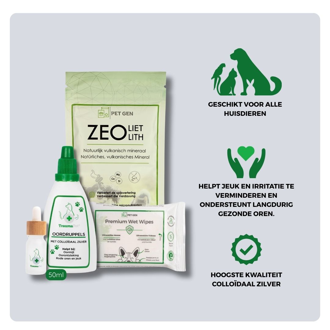 Een natuurlijk vulkanisch mineraal, rijk aan magnesium, calcium en silicium. Werkt als een spons in het spijsverteringskanaal — bindt schadelijke stoffen, ondersteunt ontgifting en bevordert een gezonde spijsvertering.