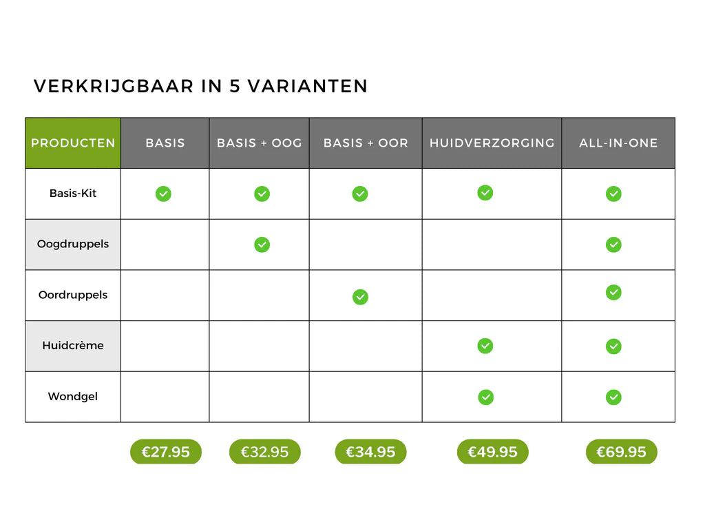 Ja, de verzorgings-kit is verkrijgbaar in verschillende varianten, waaronder deze „Huidverzorginsset“ en de „All-in-Kit“, beide uitgebreid met TraumaPet dierverzorgingsproducten met colloïdaal zilver.